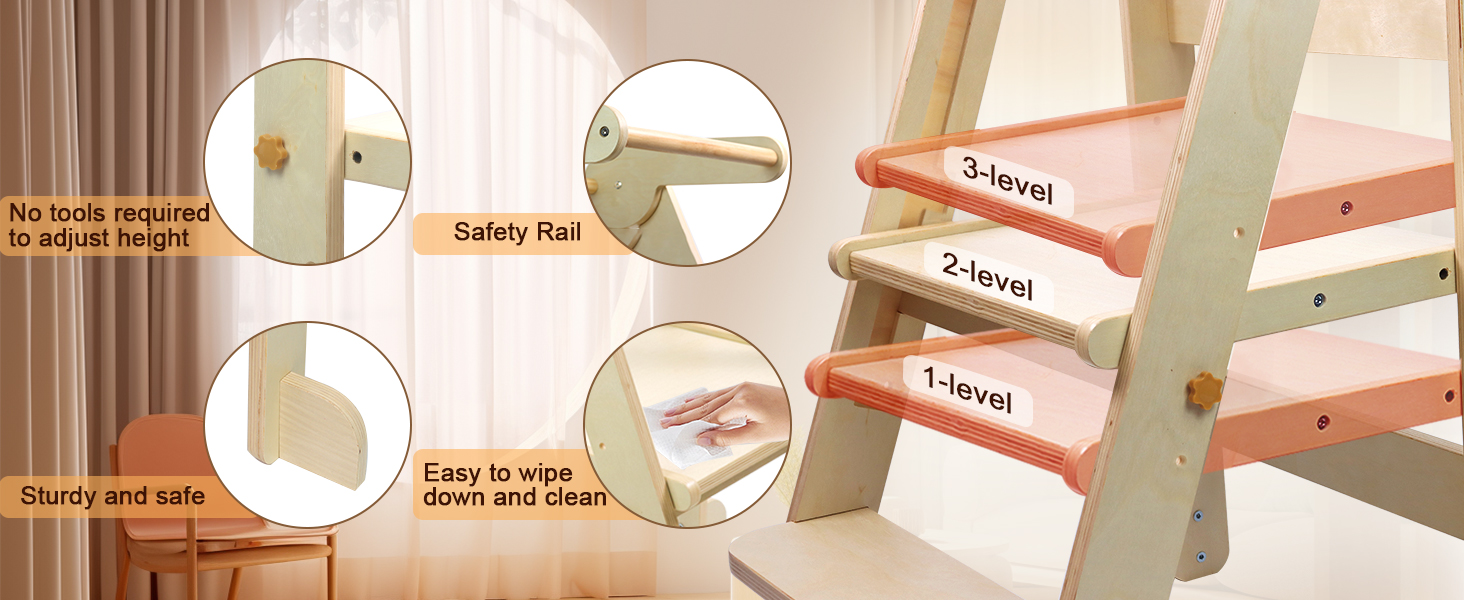 - Adjustable Height: With the flexibility of height adjustment, our learning wood tower has a two-level platform that can be adjusted in 3 different heights according to the needs of the use, which make our kitchen wood helper adapt to the various stages of your child's development