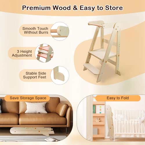 Foldable Learning Tower, Wooden Step Stool for Kids with 3 Adjustable Height
