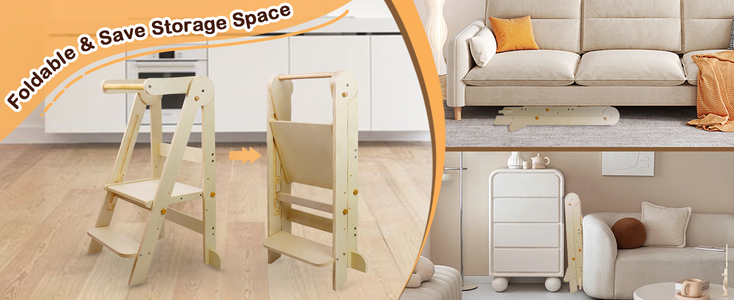 - Foldable Helper Tower: Our kitchen stool feature a foldable design that allows it to be folded for storage when not in use, saving living space. This folding kitchen step has been specifically designed to encourage toddlers to explore their surroundings, easily moving to the living room, kitchen, dining room, or bathroom, etc., wherever children need height assist in reaching the platform, it all can be used