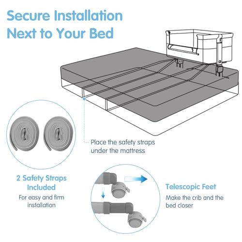 - ✔BOTTOM RACK & SAFE STRAPS- Equipped with a convenient bottom storage rack, this foldable beside cot offers ample space to organize baby essentials like clothes, towels, diapers, and toys. Moreover, the provided straps for fixing it to the parent bed, along with retractable feet for easy adjustment.