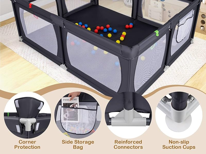 - Non-slip suction attachments stabilize the playpen on multiple floor surfaces.