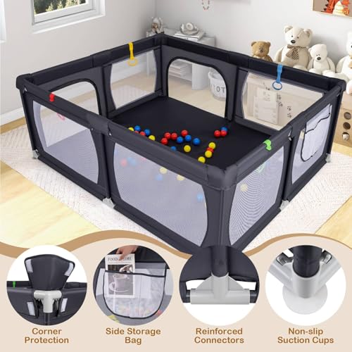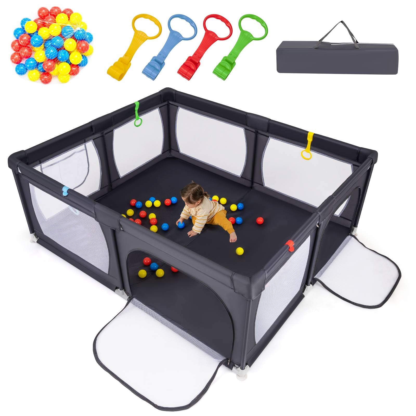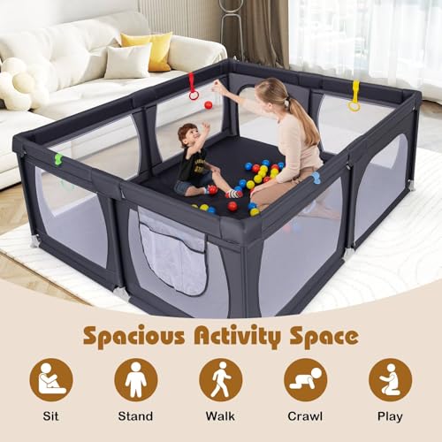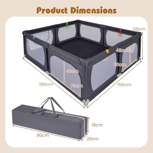GYMAX Baby Playpen, 186 x 156 cm Foldable Toddler Fence with 50 Ocean Balls, 4 Pull Rings, Breathable Mesh, Storage Pocket and Carry Bag, Indoor Outdoor Infant Play Center Yard (Dark Grey)