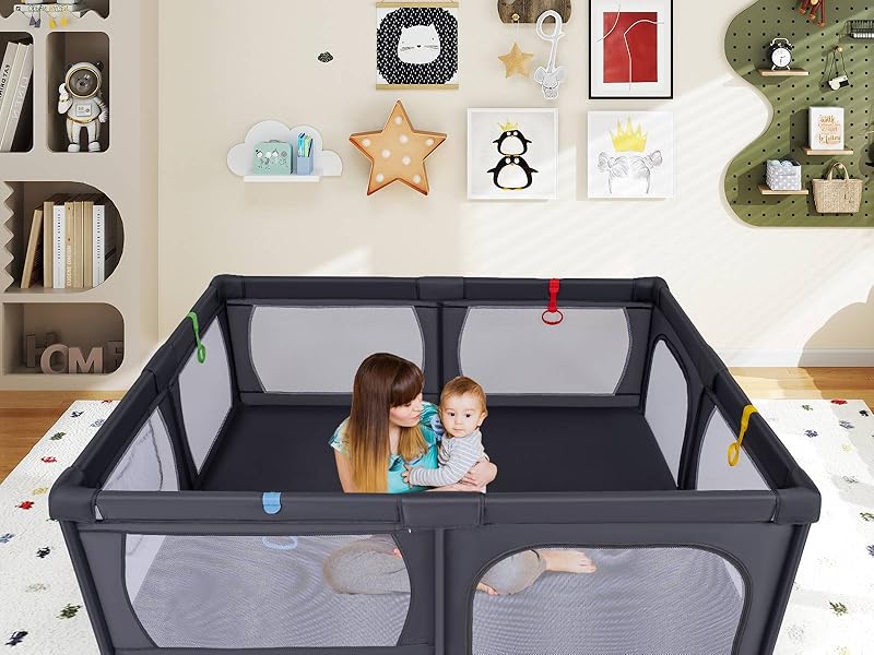 - ✔BREATHABLE AND ACCESSIBLE DESIGN- The breathable mesh sidewalls of the playard center not only improve air circulation but also offer a clear view of your child. The convenient side storage pocket allows for easy access to toys and essentials while keeping your space tidy.