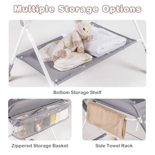 - ✔AMPLE STORAGE SPACE- The folding baby changing table is equipped with a zippered 3-compartment storage basket, side towel rack and bottom storage shelf, which can keep all your baby's essentials such as diapers, wipes, clothes, etc. within arm's reach.