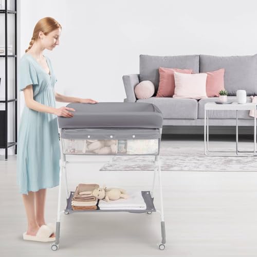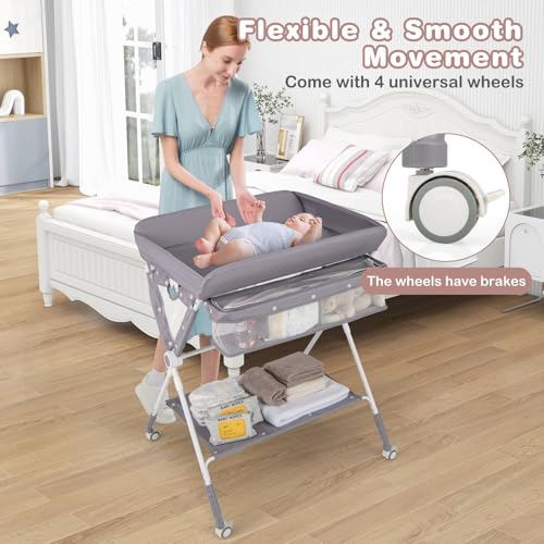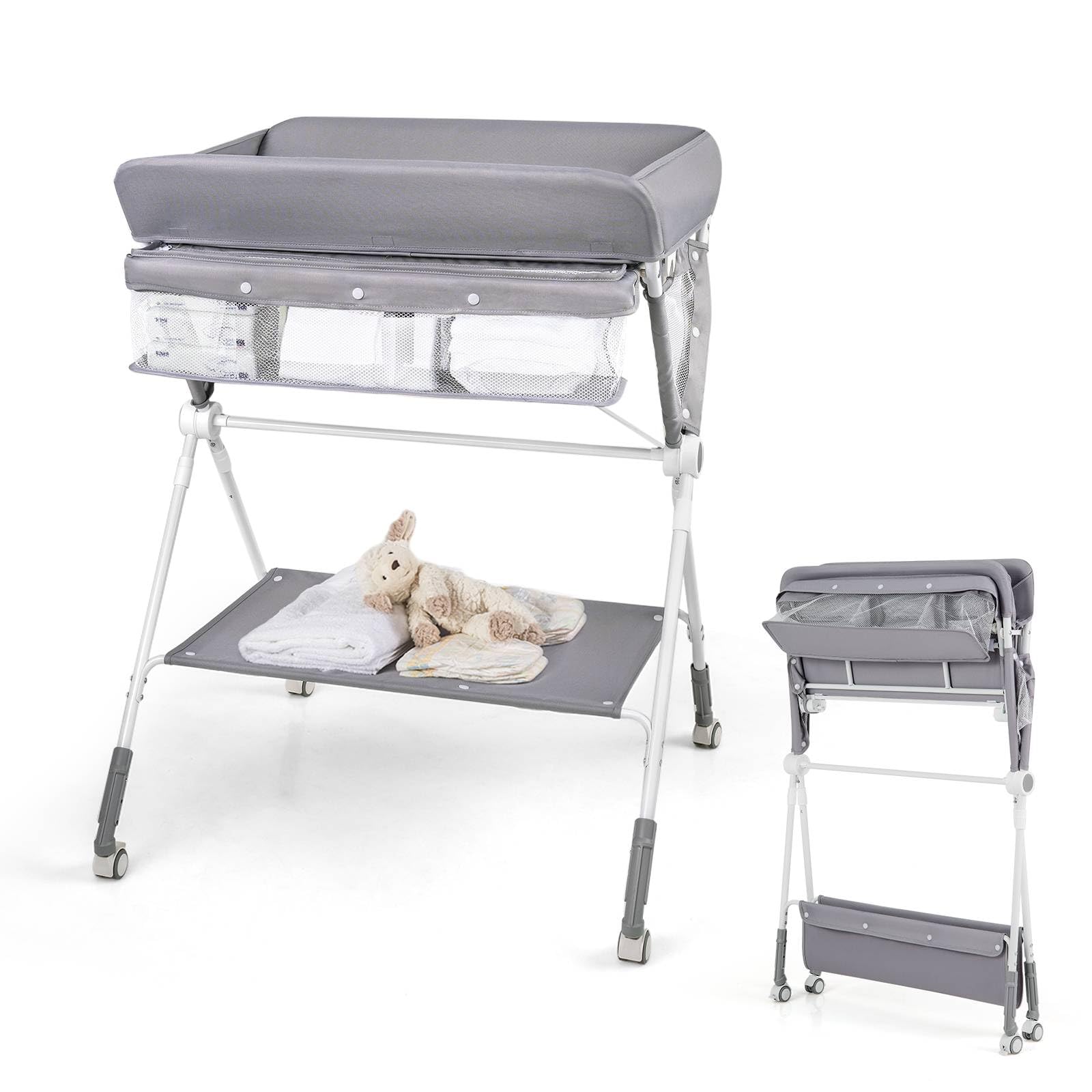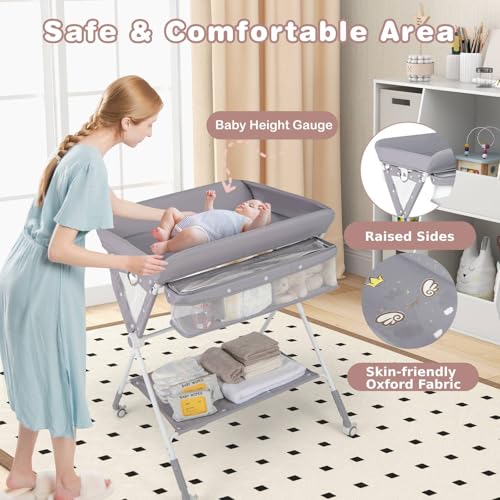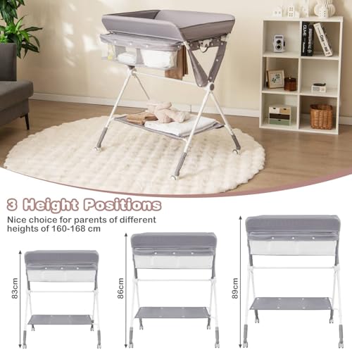 GYMAX Folding Baby Changing Table, Hight Adjustable Infant Diaper Changing Station with Wheels and Storage Basket, Portable Newborn Care Station (Grey)