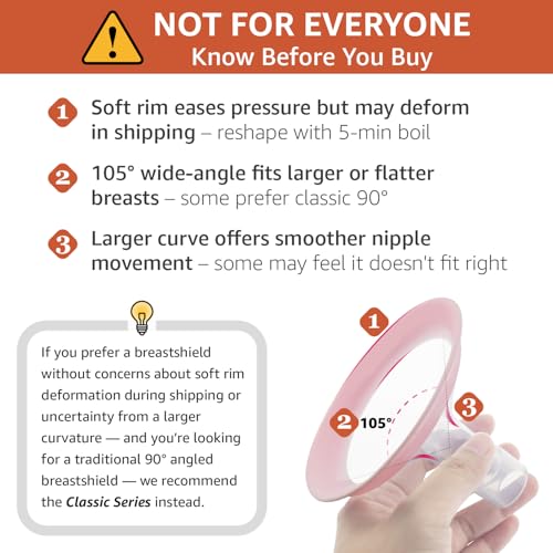 - Flange opening is 105 degree, more suitable for mothers with large breasts or flatter contour breasts; Soft and flexible edge for more comforts; Larger cup size for more covered area of breasts during pumping; elliptical-shaped design to rorate and adapt for comfortable pumping.