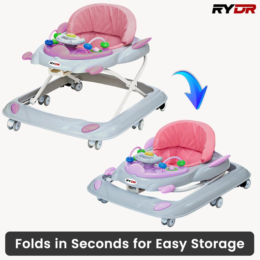 RYDR 101 Baby Walker with Wheels, Foldable Adjustable Height Walker for Babies 6–12 Months, Interactive Lights & Sounds, Toddler Walker Play Centre (Pink)