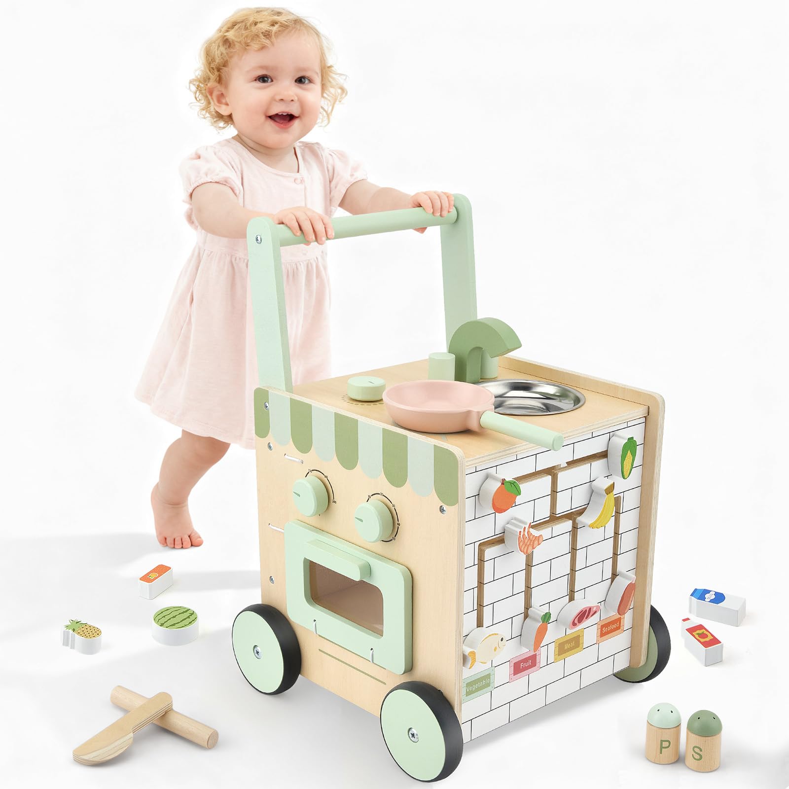 Wooden Baby Walker, Push Along Walker Toy with Pretend Play Kitchen, Baby