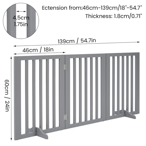 Wooden Stair Gate for Dogs, Freestanding Foldable Dog Gate Indoor with 2 Support Feet, 3 Panel Pet Gate & Dog Guard for Stairs, Doorways and Hallways (140 W x 60.5 H) (Gray)