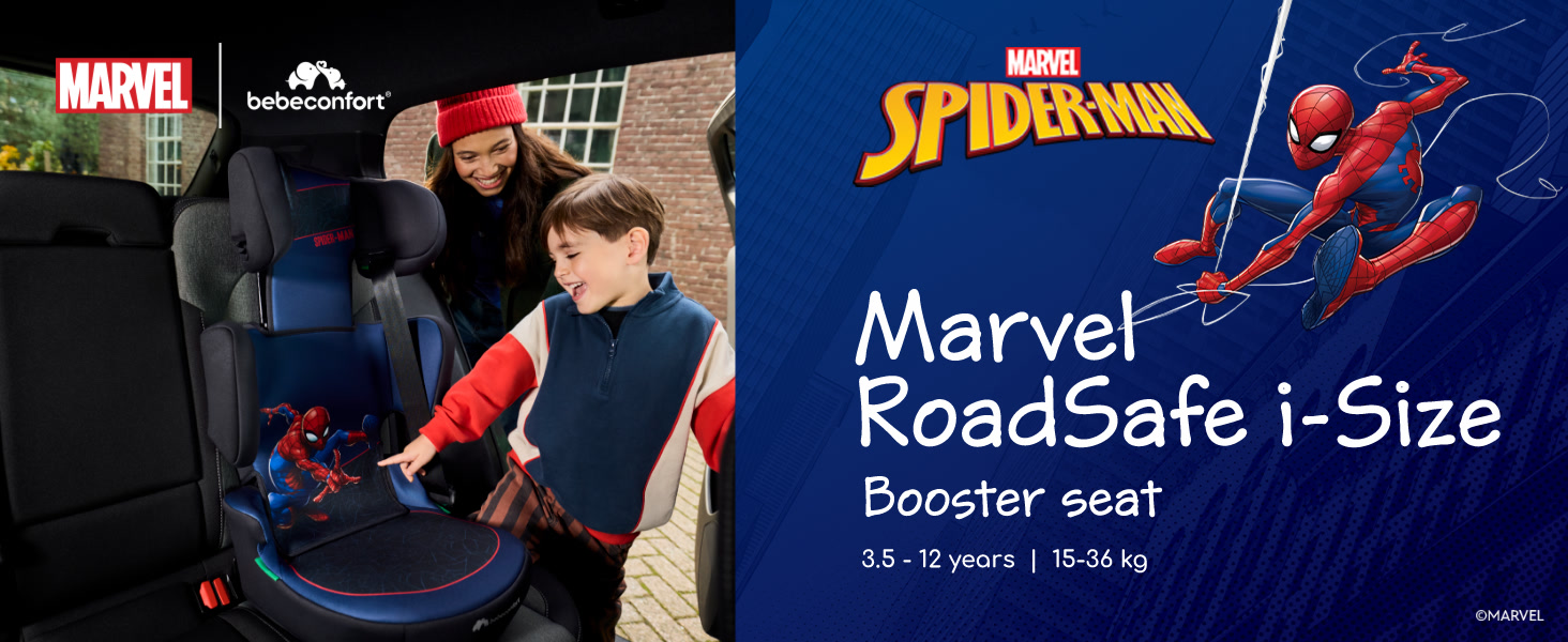 Our new range of Bebeconfort car seats has joined forces with Marvel’s Spider-Man! With dynamic and bold designs starring the iconic web-slinger, they let your little hero ride in true Spider-Man style. This lightweight booster seat is suitable for children from approximately 3.5 years old up to approximately 12 years old, for children with a height between 100 and 150cm. This booster seat can easily be installed using the seat belts of your car. Comfort is, next to safety, one of the main priorities for you as a parent when transporting your child. Therefore, RoadSafe i-Size has superior cushioning, an extra padded seat and a cushioned headrest which can easily be adjusted to 14 different positions with one hand. RoadSafe i-Size weighs less than 4kg and thanks to the unique compact foldable design of the seat, you can easily transport it and install it in different cars with the seat belts of your car. Let the adventures unfold with the Bebeconfort RoadSafe i-Size booster seat.