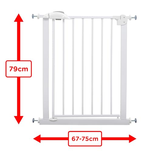 - Dimensions: Gate Width (adjustable): 67–75cm. Gate Height: 79cm