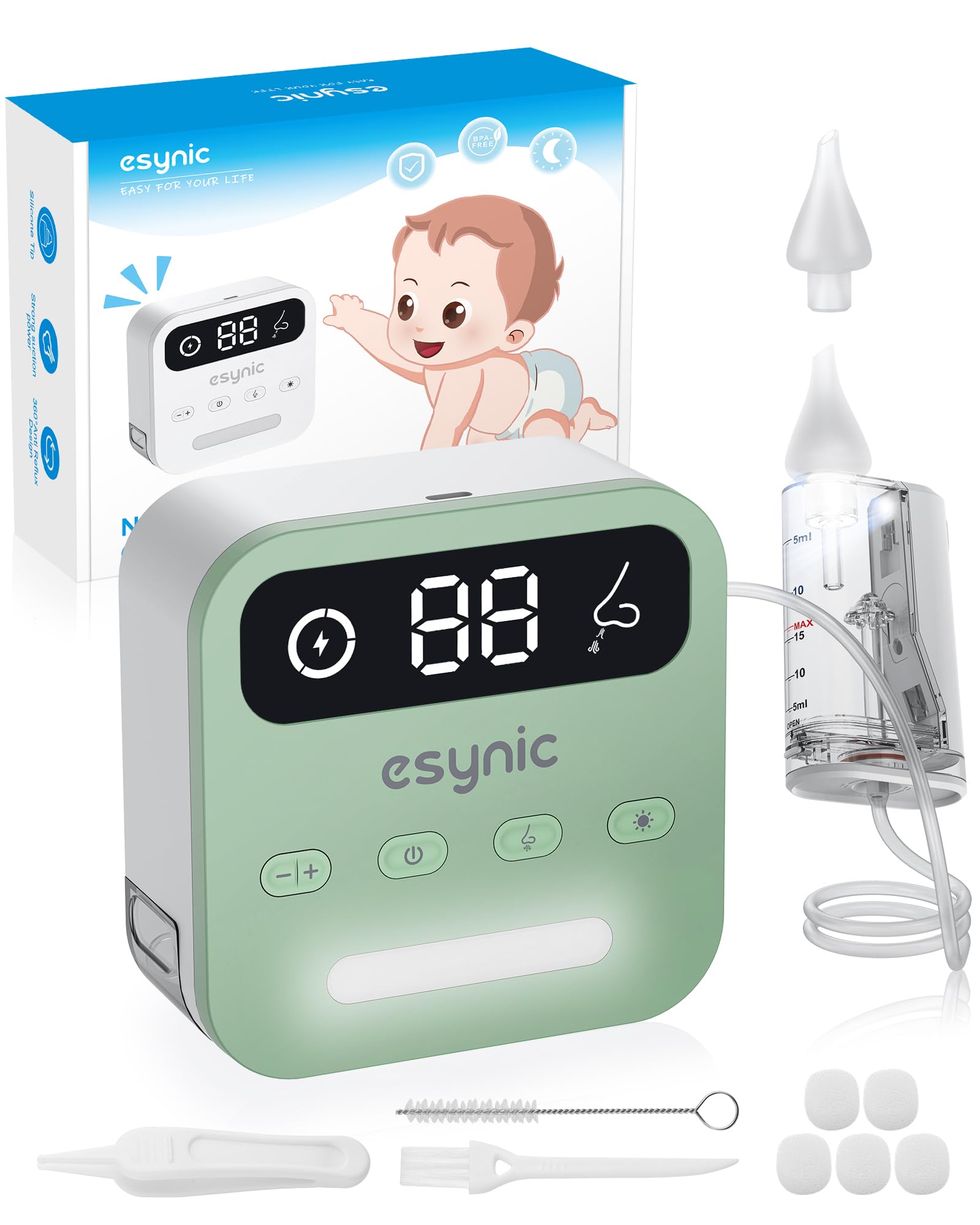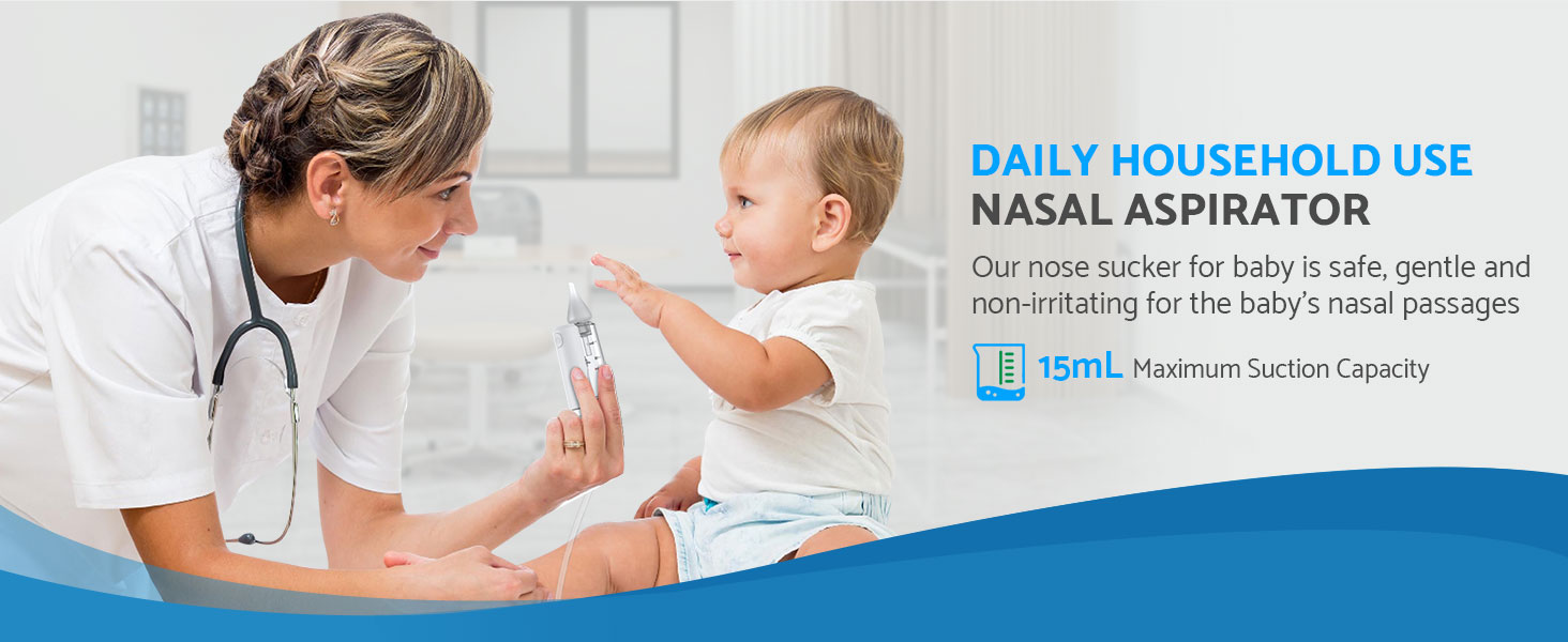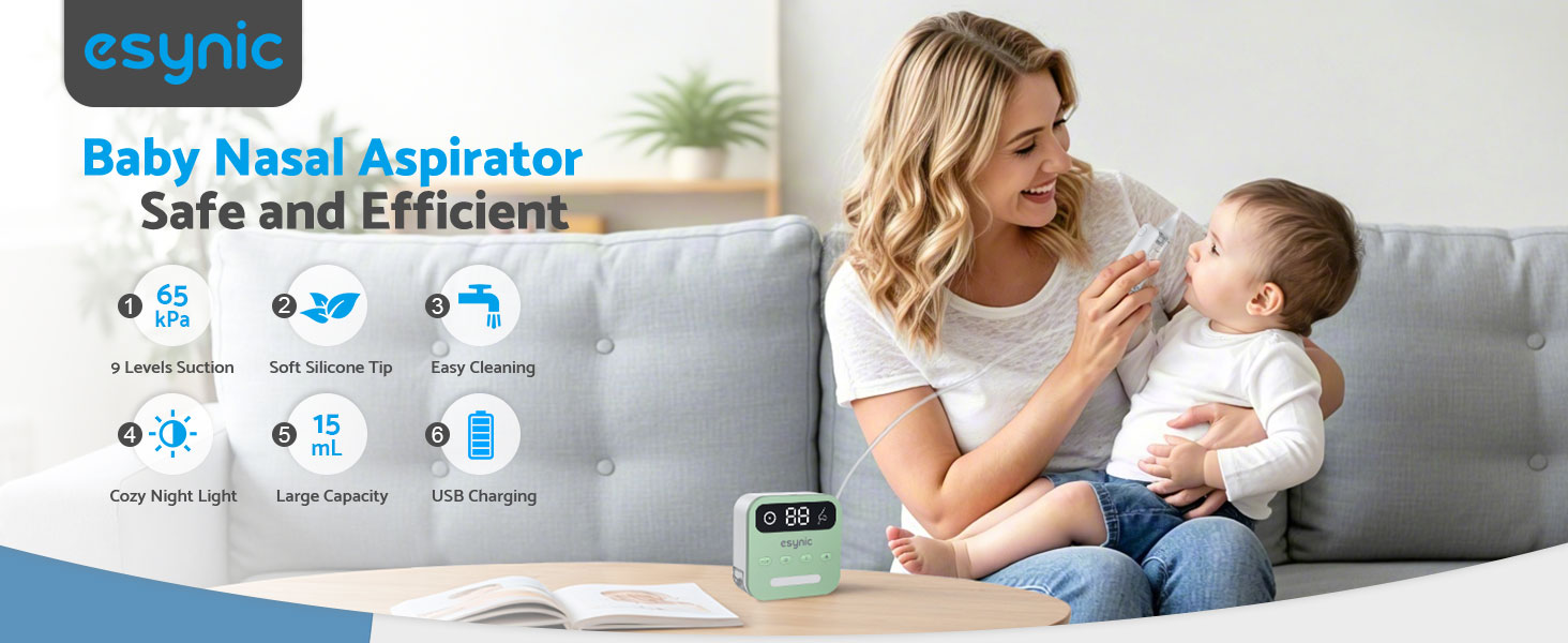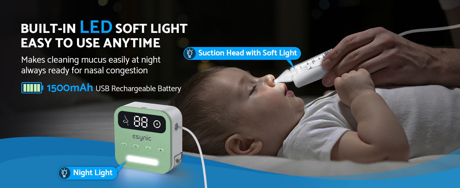 - *Quick, Hygienic Cleaning With a Large-Capacity Design*—-: Featuring a 15mL Silicone Suction Head With an Angled Tip, Our Nasal Aspirator for Baby Quickly Draws Out Mucus in One Go, Reducing Interruptions. Made From Soft, Food-Grade Silicone, the Tip Is Gentle on Little Noses, While the Built-In Light Lets You Use This Baby Nose Aspirator Even in Dim Lighting for Added Convenience