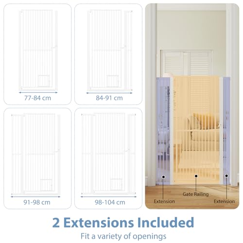 - Adjustable Width: Our dog gate features 2 different length extension, allowing easy adaptation to openings between 77-104 cm in width. Perfectly suited for corridors, stairs, and rooms, this pet fence flexibly meets the layout needs of your home.