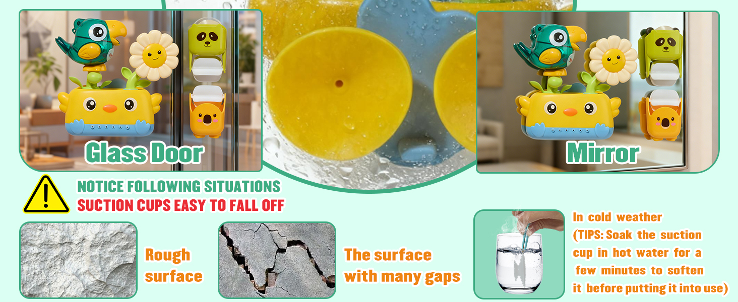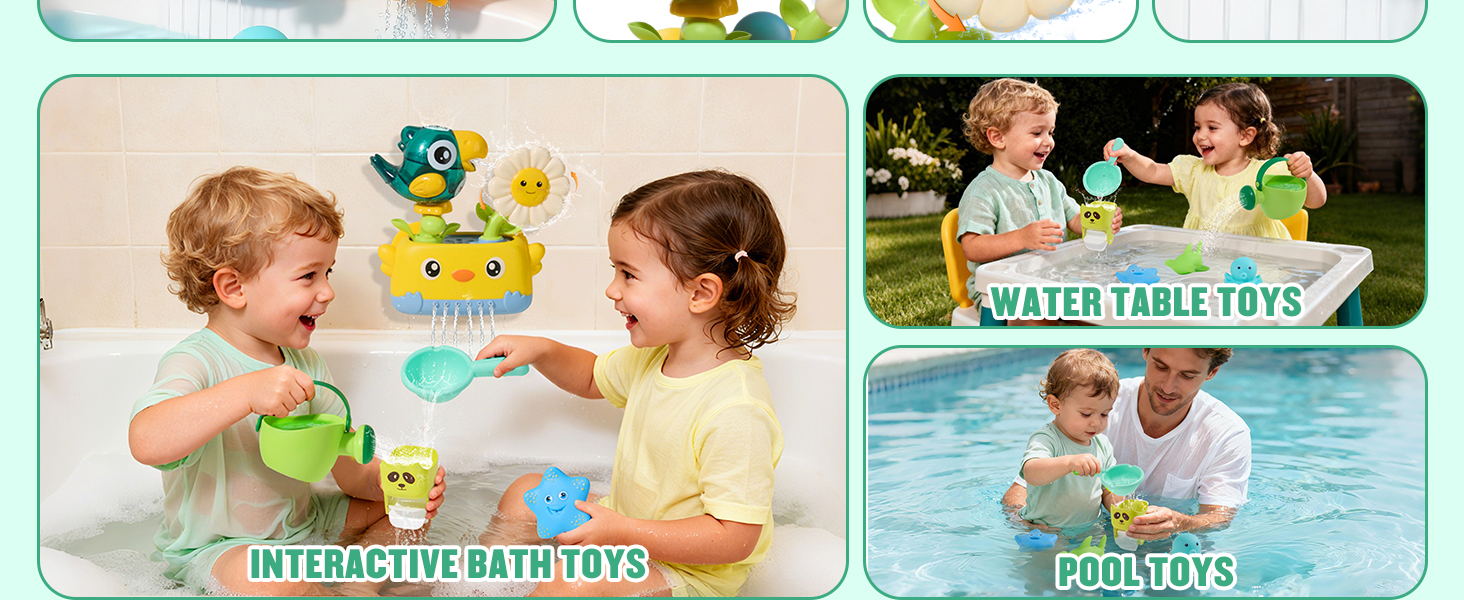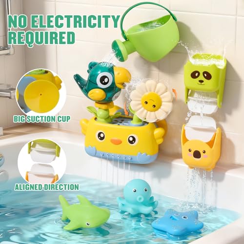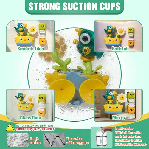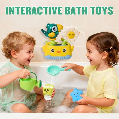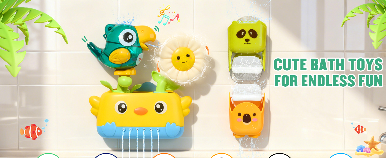 - 【FUN BATH TOYS SET】The baby bath toys set designed with animals themed which includes a bird bath toy with suction cups, 2 rotating waterfall cups, 3 soft rubber no hole bath toys, a watering can, and a spoon. The bath toys for babies designed with bright colors and easy-grip shapes, it effectively capture your baby's attention and turn bath time into a fun learning experience. The toddler bath toys also comes with a convenient drying mesh bag, making storage simple and keeping your bath toys for kids ages 1-3 organized and mold free