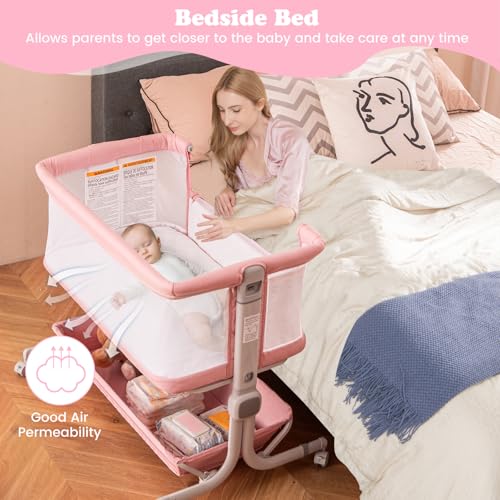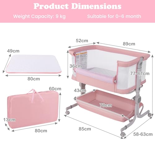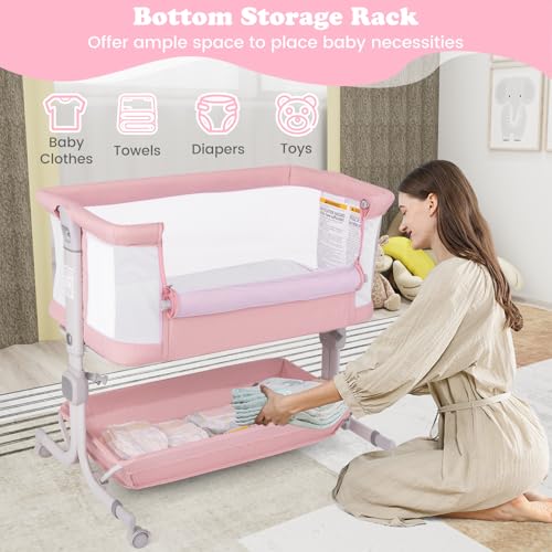 GYMAX Baby Bedside Crib, Foldable Toddler Side Cot with Mattress, Lockable Wheels, Storage Shelf and Carry Bag, 6-Level Heights Adjustable Infant Bassinet for Newborns (Pink)