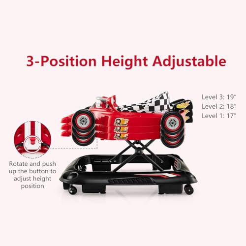 - 3 Adjustable Heights: The baby walker is designed for 3 adjustable heights 17”, 18”, 19” to suit the height of boys and girls. The rear wheel has a deceleration function to ensure safety
