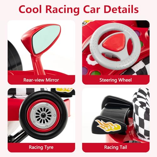 - Fun Activity Center: The toddler activity center has a cool racing car appearance, and equipped with steering wheel, gear lever, rearview mirror and light buttons to satisfy your child's curiosity for exploration and early learning. Requires 2 AA batteries (not included)