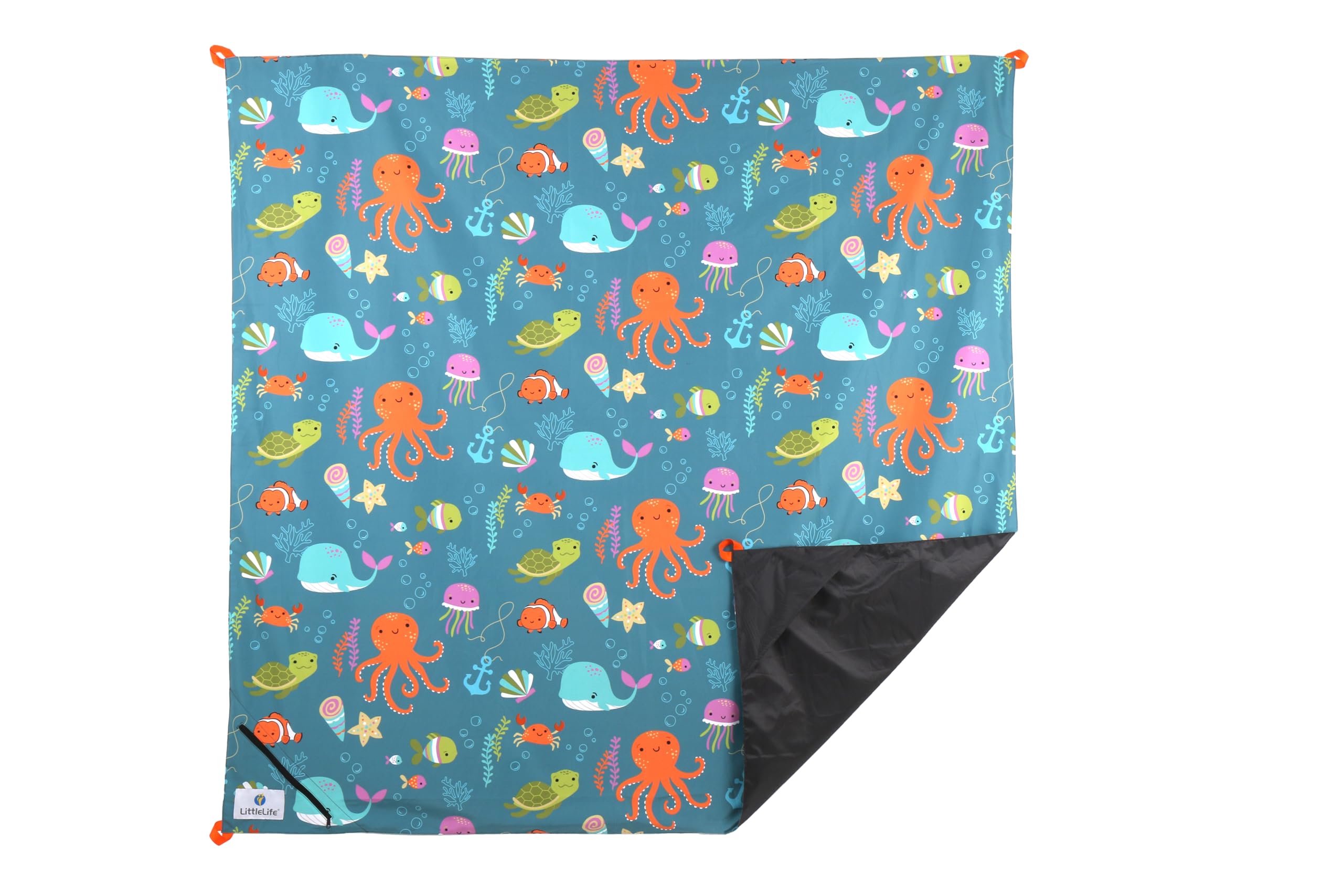LittleLife Portable Travel Play Mat | Waterproof Playmat for Babies and Toddlers with Peg Points and Sand Pockets, Ideal for Beach Days, Picnics and Camping Holidays, 1.5m x 1.5m, Sea Animals Theme