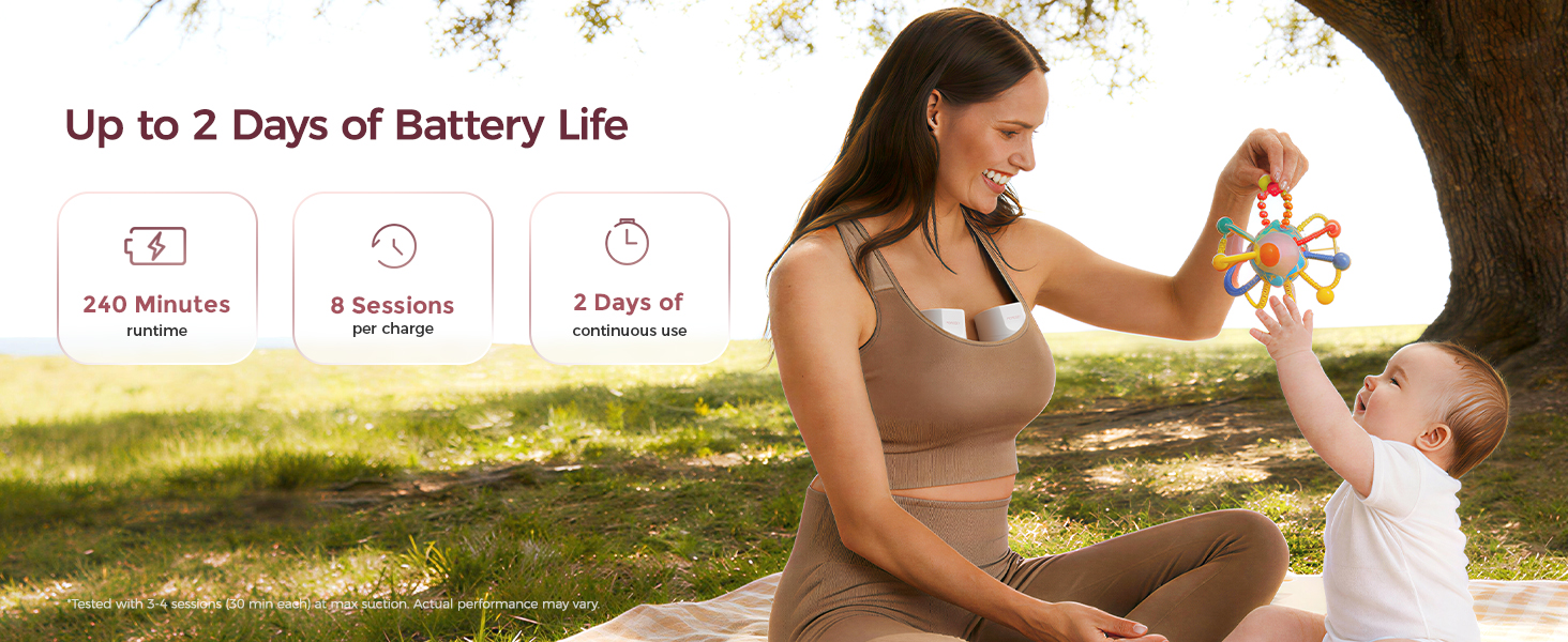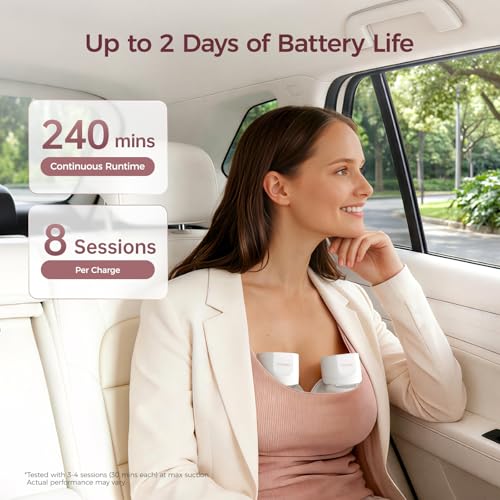 - Long-Lasting Power & Quiet Use. 1350 mAh battery supports up to 8 sessions (240 min) on one charge. ≤46 dB whisper-quiet for discreet pumping anywhere.