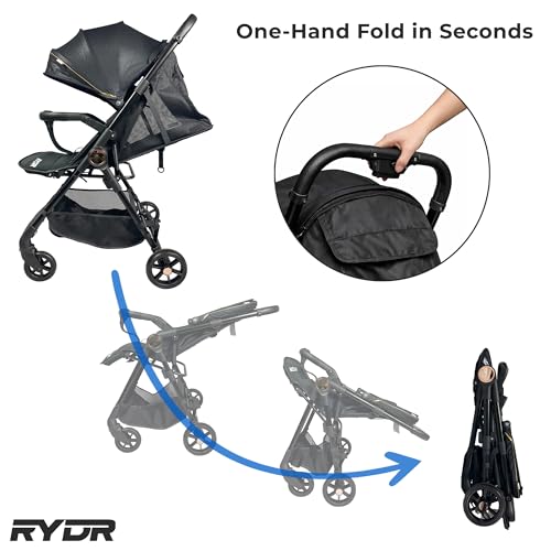 RYDR V5 Lightweight Pushchair, Compact Folding Stroller for Newborn to 4 Years, Travel Buggy with One-Hand Fold, 5-Point Harness, Suspension Wheels, Black