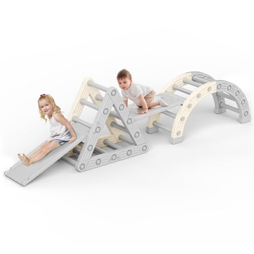 Toddlers Climbing Frame Set with Slide, Pikler Triangle and Arch Climber for Indoor Active Play (Triangular Climbing Frame + Half-Circle + Ladder + Slide (Includes 4 Footpads) – Beige and Grey)