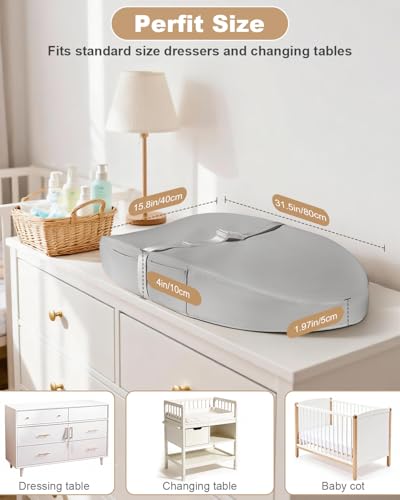 - Standard Dimensions: 31.5 in x 15.8 in x 4 in (80 cm x 40 cm x 10 cm), fits for most changing tables, dressers, and nursery, this lightweight 2.2 lbs portable changing pad , added two pockets (5.7in x 3.6in) to provide extra storage space, It can hold a small amount of diapers, pacifiers, diaper rash cream, wet wipes and other necessities