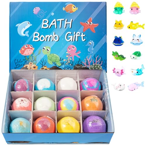 12Pcs/Set Bath Bombs with Toys Inside 2 Inch Bath Bombs with Cute Animal Toys, Child-Safe Fizzy Colorful Bubble Bathroom Supplies for Kids are perfect for making bath time magical and fun; each colorful bath bomb dissolves quickly in warm water creating vibrant fizzy bubbles while revealing a surprise child-safe animal toy inside that sparks joy and curiosity; crafted with gentle, non-toxic ingredients ideal for kids’ sensitive skin, these bath bombs ensure safe and soothing baths; the set of 12 a wonderful option for birthdays, holidays, or any special occasion, providing endless entertainment, while the easy-to-clean formula leaves no messy residue, making bath time enjoyable and hassle-free for both kids and parents.