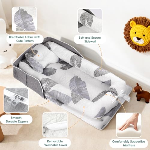 - PORTABLE & COMPACT TODDLER TRAVEL BED:Weighing just 3 lbs,this portable baby nest folds in seconds into a compact size (33.4''x17.1'' when unfolded) for on-the-go convenience. Perfect for holidays, picnics, or visits to grandparents, it includes an adjustable shoulder strap and storage pockets. Use it as a portable baby lounger indoors or outdoors—your little one’s home-comfort companion wherever you roam.