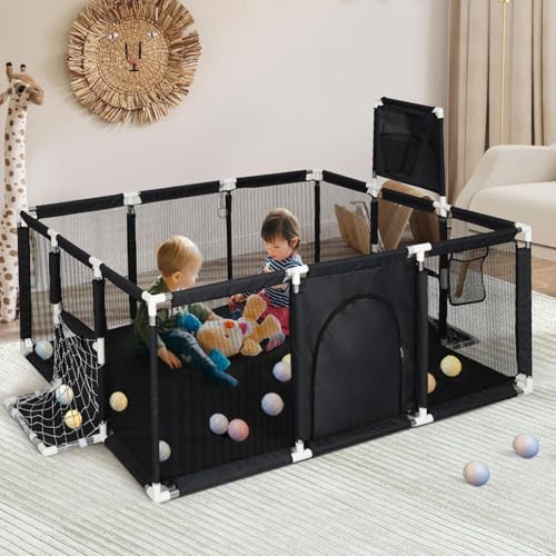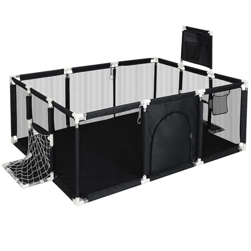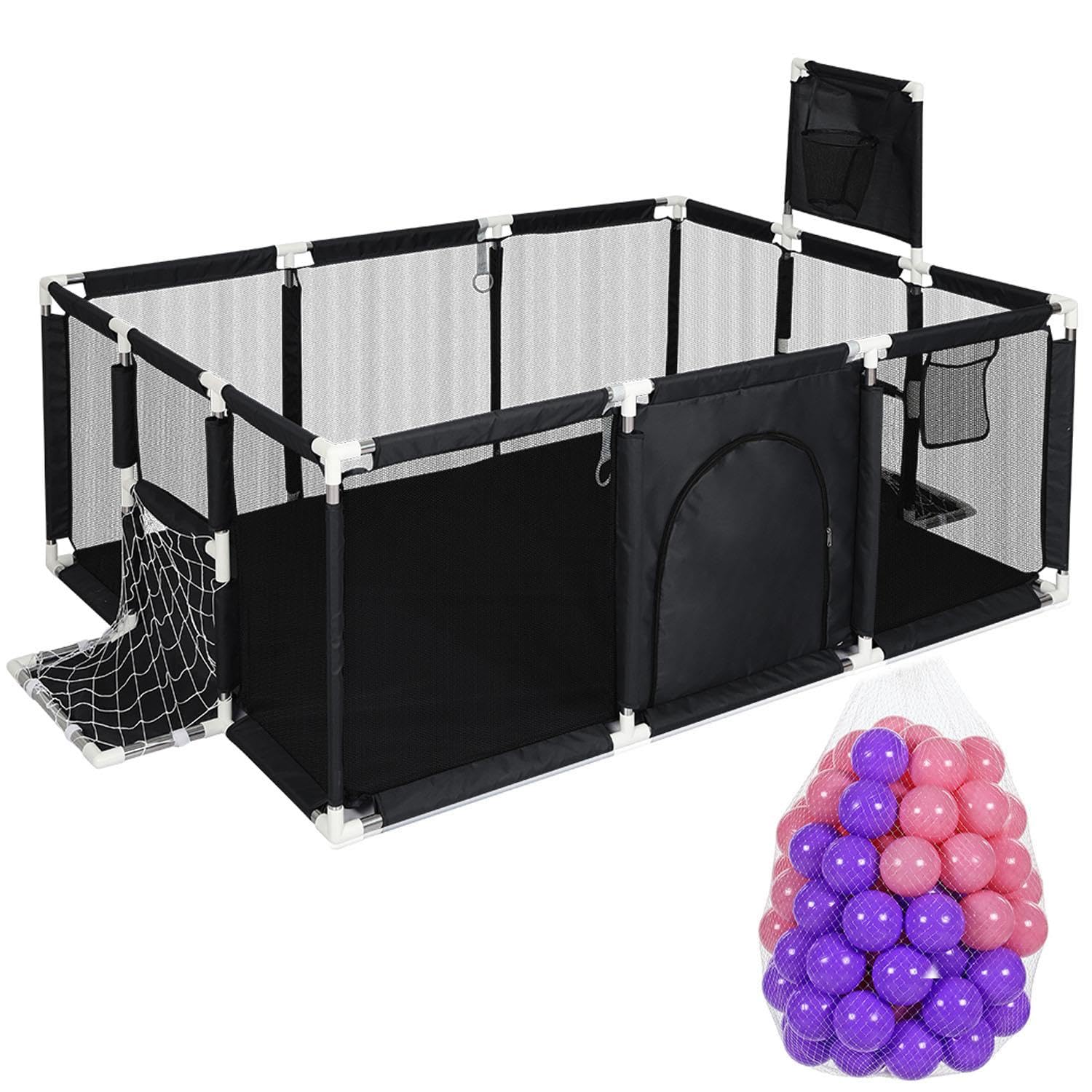Baby Playpen 178x120cm Large Toddler Play Yard with 100 Balls, Basketball Hoop & Soccer Net, Breathable Mesh Safety Play Area with Zipper Door, Indoor Outdoor Activity Centre (Black)