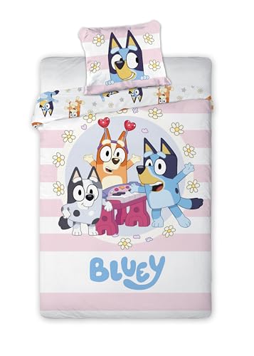 Bluey Children's Bedding Set – 100% Cotton – Duvet Cover 100 x 135 cm + Pillowcase 40 x 60 cm – Bluey, Bingo and Muffin Motif – Oeko-TEX Certified – Pink and White Striped