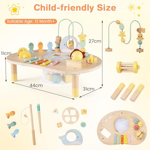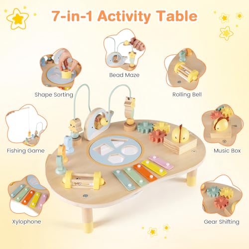 COSTWAY Activity Table for 1+ Year Old, 7-in-1 Wooden Montessori Toy Busy Board with Bead Maze, Fishing Game, Xylophone, Music Box, Shape Sorter, Toddler Sensory Learning Table for Boys Girls