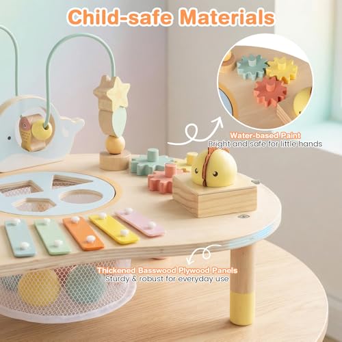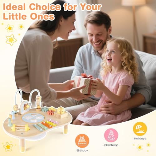 - 【7-in-1 Activity Table】This baby play table features a rolling bell, a xylophone, and a music box, all providing pleasant sounds to ignite little one's curiosity. It also includes engaging activities like shape sorting, gear shifting, bead maze, and fishing, turning playtime into a sensory adventure.