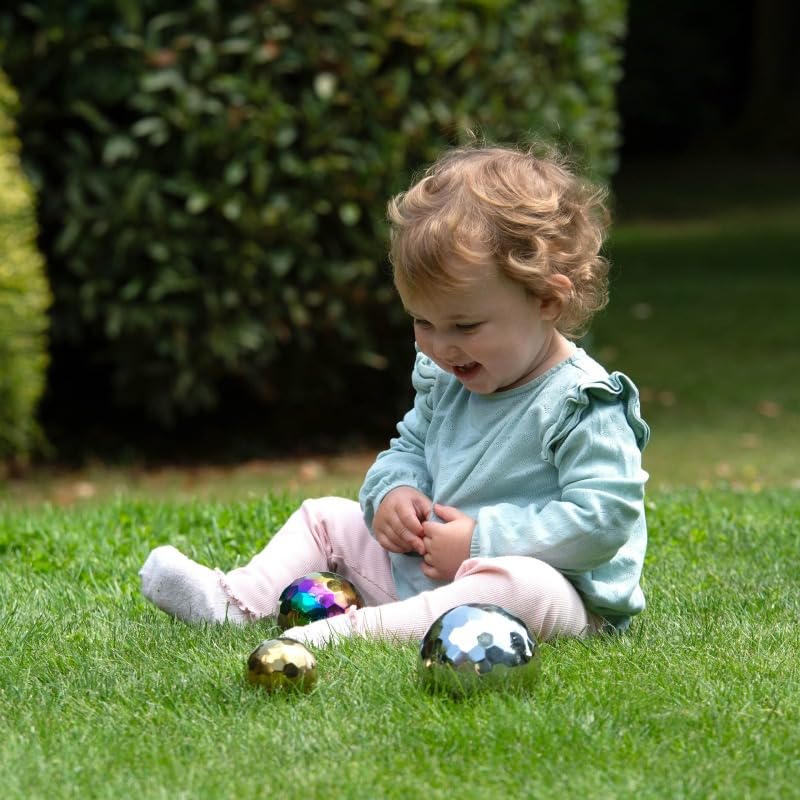 Robustly constructed from stainless steel in shiny faceted gold, silver and colourburst finishes. Each ball has different contents to produce varied sound and movement effects, and the uneven surfaces cause the balls to roll unpredictably. The hand polished mirrored surface provides distorted patterned reflections which are fascinating for children to observe. The balls are graduated in size and ideal for young babies to hold, roll around and crawl after. Lightweight but robust, the Sensory Steel range is highly appealing to children with SEND, for developing descriptive language and to encourage motor skills. Stainless steel is an ideal material for using in sensory play resources: • Chemical free – no toxins • Durable – strong and lightweight • Hygienic – non-porous and naturally bacteria resistant