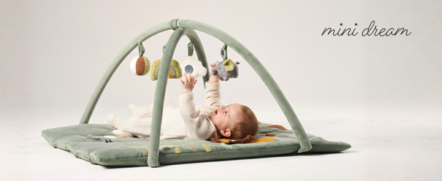 The MiniDream playmat is designed for 0-12 months+. The playmat converts from overhead activity gym to secure play mat space, giving babies a comfortable area for exploration, rolling, and independent play as they grow