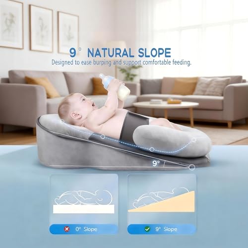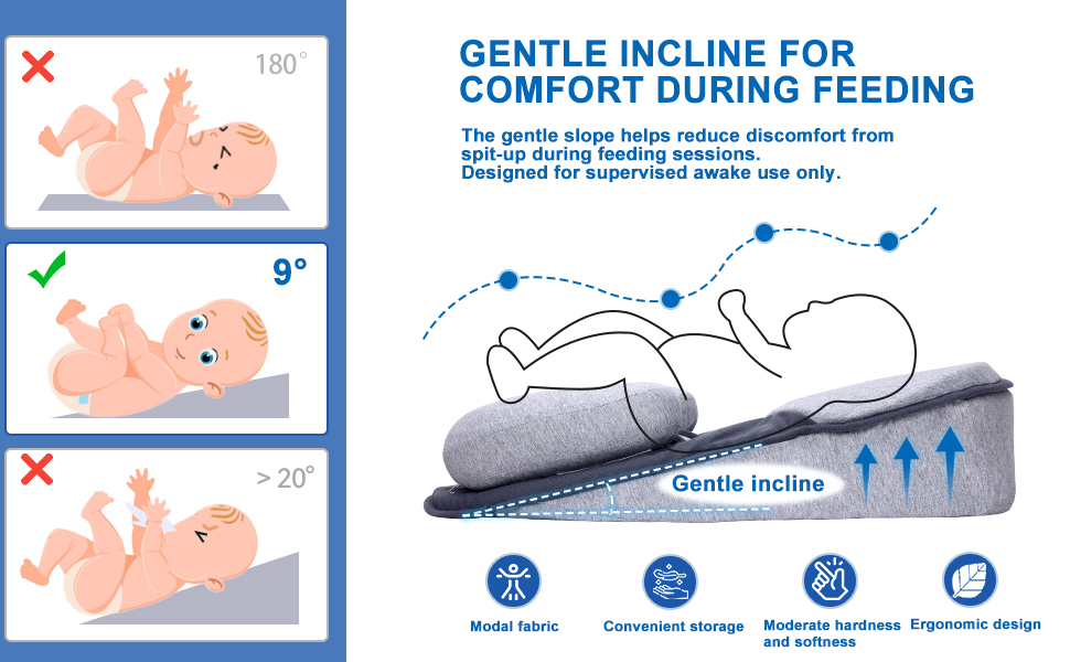 - 【Ergonomic Design】Specifically designed with a 9° golden slopeto support your baby duringfeeding sessions, thisbaby wedge pillowaligns with the newborn's delicatecervical spine. This gentle angle assists in naturalburpingand helps reduce discomfort frommilk refluxand spit-up while the baby isawake. The specialisedgroove designcradles the head to support healthy shape development during supervised use.Note: For awake feeding only. Not suitable for sleeping.