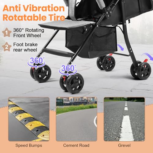 Baby Pram, One-Hand Fold Baby Pushchair with Adjustable Canopy & Backrest, Cup Holder, Storage Basket, Lightweight Foldable Compact Travel Stroller Buggy for Newborns, Toddlers, 0-2 Years (Grey)