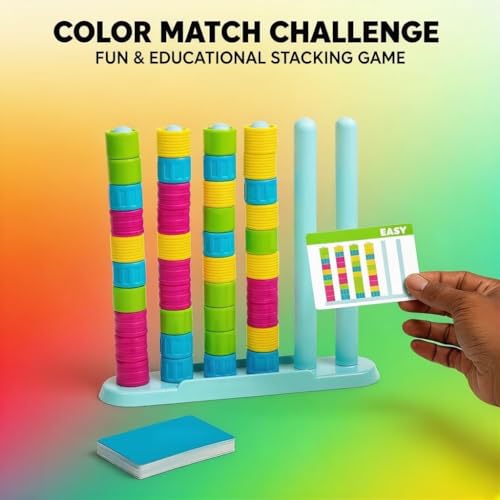 Colour Stack Challenge Game, Color Matching Stacking Puzzle Game, Color Matching Stacking Puzzle Game with Racks, Rings & Cards for Kids and Adults (1 Set)