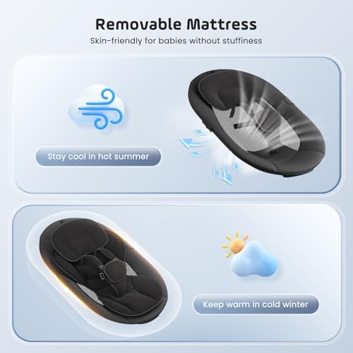 - 【Ergonomic Newborn Swing (0-6 Months)】Built with a durable aluminium alloy base and iron seat frame, this newborn baby swing provides superior stability for babies from birth up to 20 lbs. The ergonomic seat mimics a mother’s embrace, supporting proper posture. Designed for both indoor and outdoor use, it effectively frees your hands, making it an ideal baby shower gift for new parents.