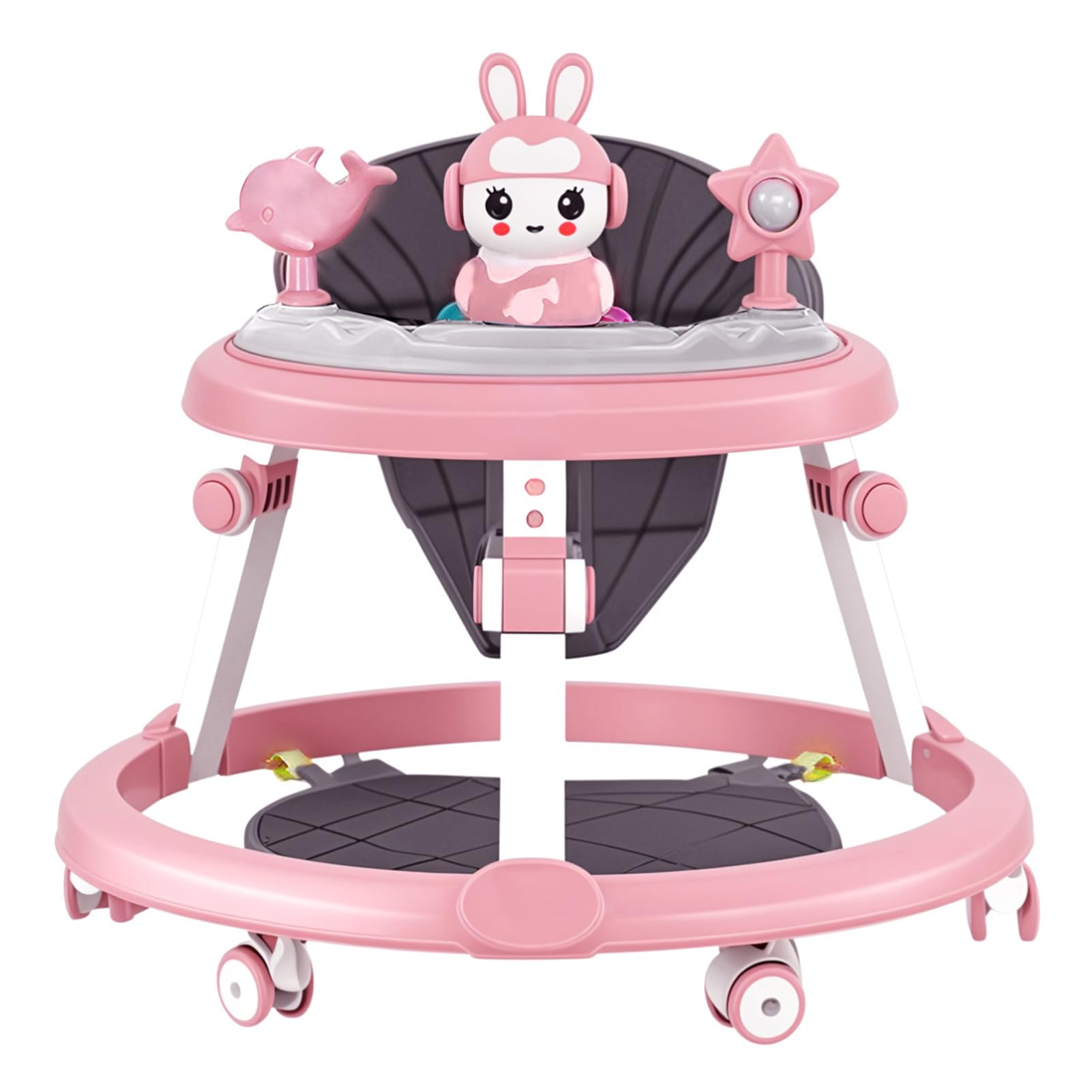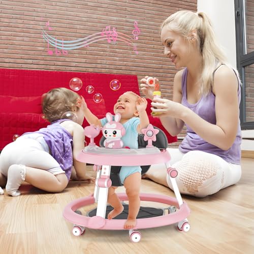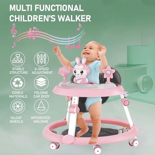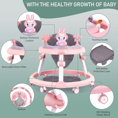 Foldable Baby Walker, Adjustable Height Infant Walker Activity Walkers Center Anti Rollover Design, Baby Learning Walkers with Music Tray Mute Wheels Portable Toddler Walker for 6 to 18 Months (Pink)