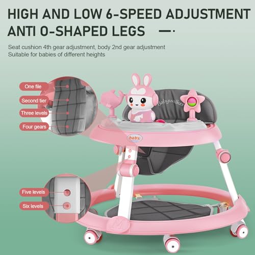 - Infant Walker Adjustable Height Toddler Walker: Fixed seating cannot match rapid growth stages, this infant walker offers 2 level frame adjustment and 5 level cushion adjustment, providing proper seating height and comfort as babies develop mobility and coordination skills