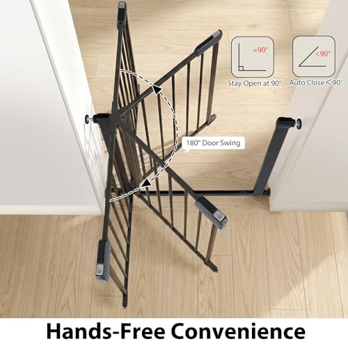 - ✔AUTOMATIC CONVENIENCE- The stair gate closes automatically if opened less than 90°, but remains securely open at 90°, offering effortless convenience and safety during household activities.