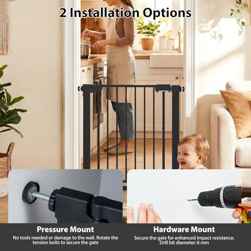 - ✔INSTALLATION FLEXIBILITY- The child gate is easy to install using two methods. Pressure mounting with rotating bolts, ideal for those who do not want to drill holes, or drilling for even greater stability, adapting to every household need.