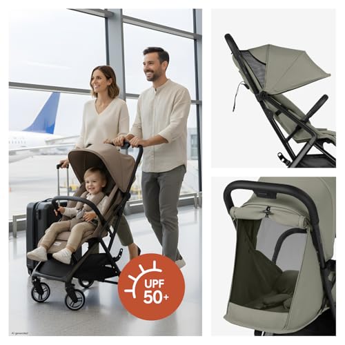 - Comfort for your toddler: Travel buggy with padded seat cushion, adjustable backrest with lie-flat position, 5-point harness, swivel safety bar, large UPF 50+ sun canopy and mesh window for airflow