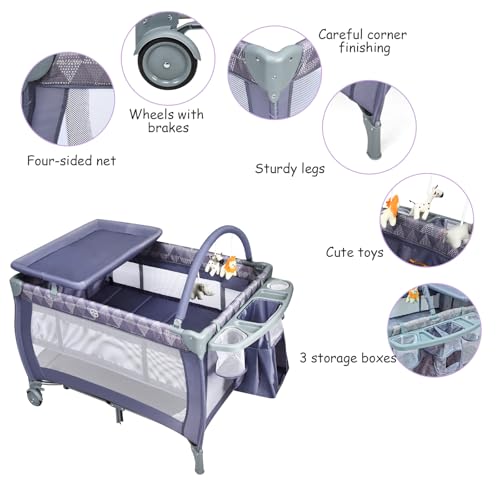 3 Storage Boxes & Smooth Wheels: The extra 3 storage boxes give a perfect space to place diapers, nursing bottles and more for handy use. In addition, the wheels with brakes make this infant playpen features easy transportation and remains static condition when in need.