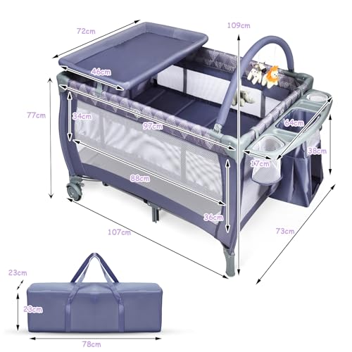 Maxmass 3 in 1 Baby Travel Cot, Foldable Bedside Crib with Changing Table, Hanging Toys, Wheel, Carry Bag, Infants Nursery Center Baby Cot Bed for 0-36 Months (Gray)