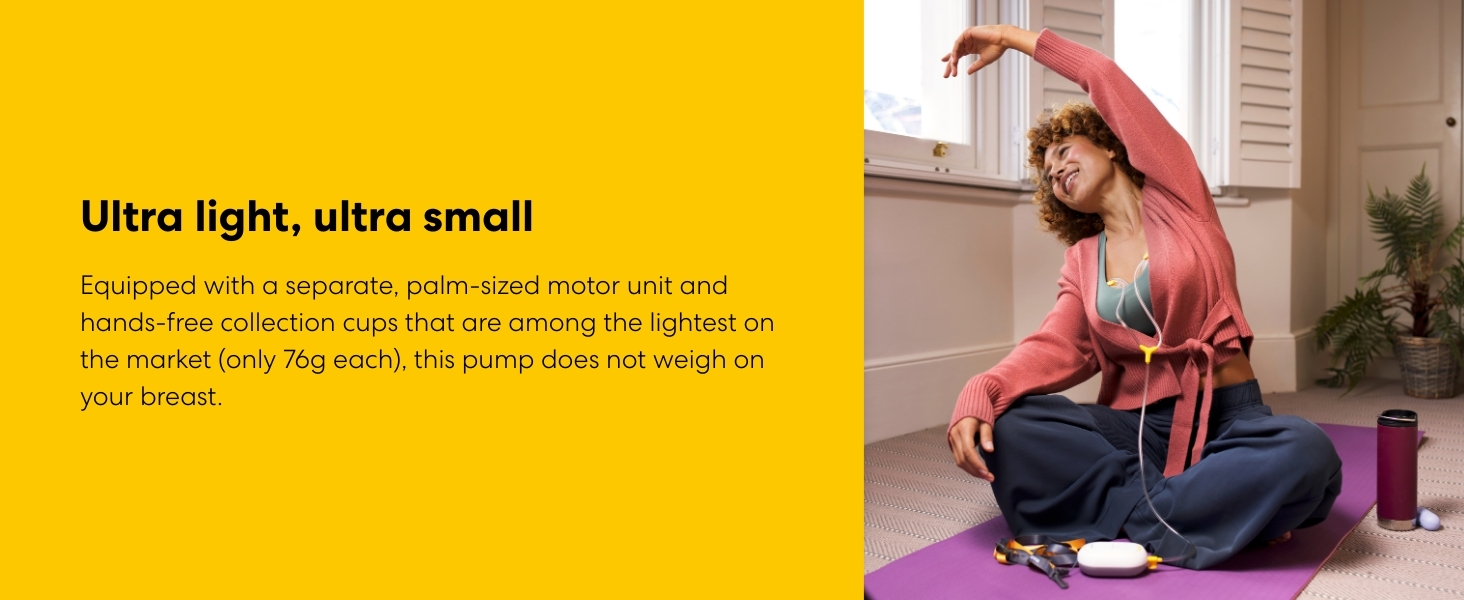 - Ultra light, ultra small: A separate, palm-sized motor unit and hands-free collection cups that are among the lightest on the market, this pump does not weigh on your breast.