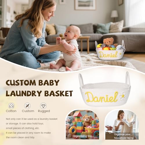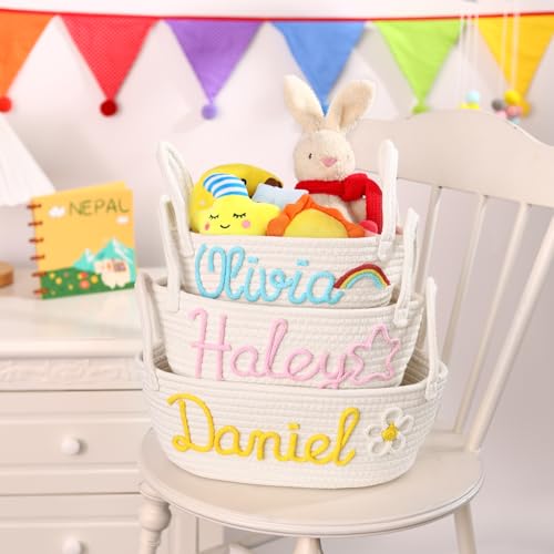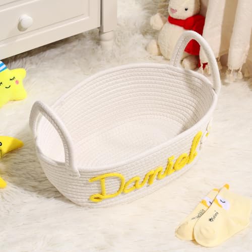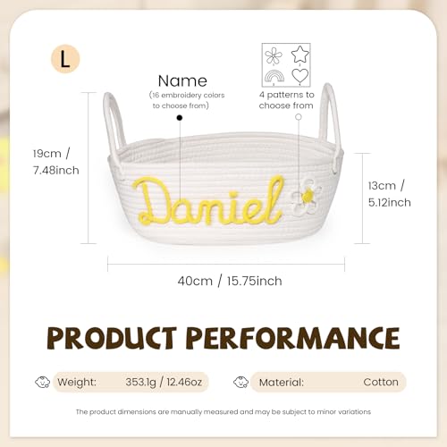 Personalised Rope Storage Basket with Name, Embroidered Baby Organiser Bin for Nappies Toys Skincare Desk and Home Storage,Custom Cotton Woven Nursery Basket with Handles (40*19*13cm)