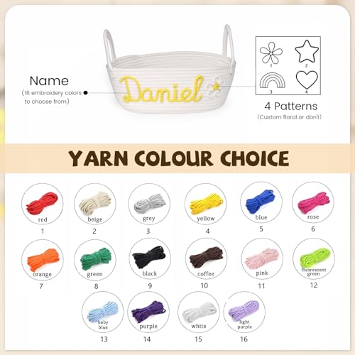 - This storage basket can be personalised with a name, allowing you to add a monogram as desired. Choose from various embroidery colours and decorative motifs such as flowers, stars, rainbows, or hearts to transform an ordinary storage basket into a uniquely decorative piece. Whether placed in a nursery, desk corner, or dressing table, it adds a touch of warmth and individuality.