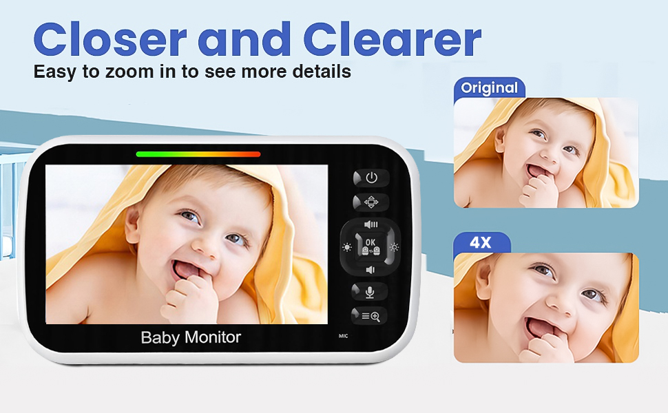 - 4x Zoom Flexible View with Manual Adjustment: Easily tilt and pivot the baby cam by hand (can also be controlled from the screen) to frame the perfect view of the cot. Use the 4x digital zoom to watch your baby's expressions and movements more closely, ensuring they're always in sight