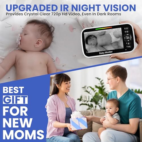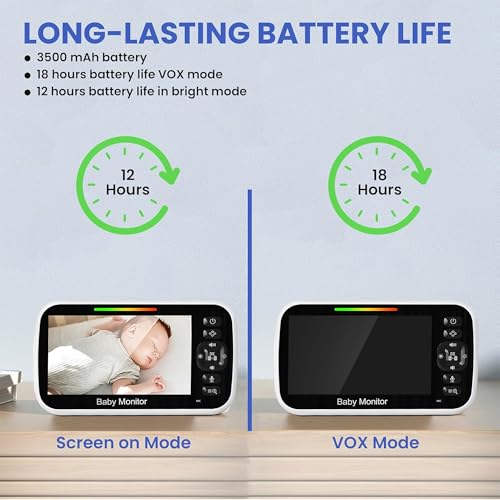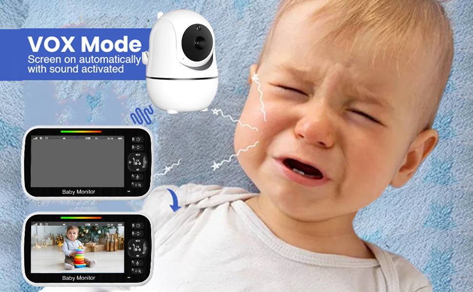 - Automatic infrared night vision on this baby monitor keeps your baby clearly visible in the dark while the screen can stay off for deeper rest, and when any sound reaches your chosen VOX level the display instantly wakes with a 3-level color sound indicator so you can quickly see at a glance when your little one needs you without constantly watching the baby camera monitor